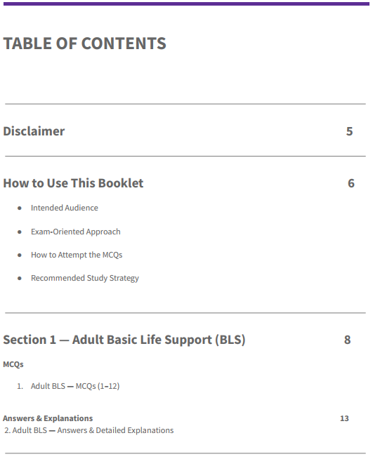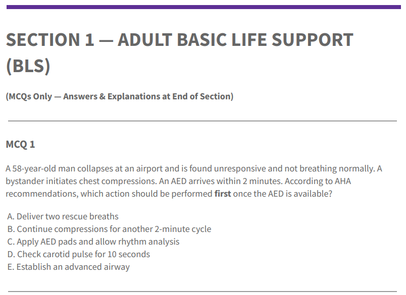 This PDF booklet contains 50 carefully designed, board-level multiple-choice questions (MCQs) based on current American Heart Association (AHA) CPR & Emergency Cardiovascular Care (ECC) guideline concepts.