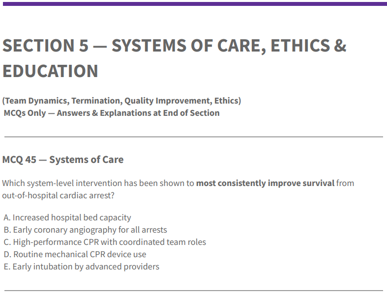 ✔ Covers Adult BLS, ALS, Post-ROSC care, Special Circumstances, Ethics & Systems